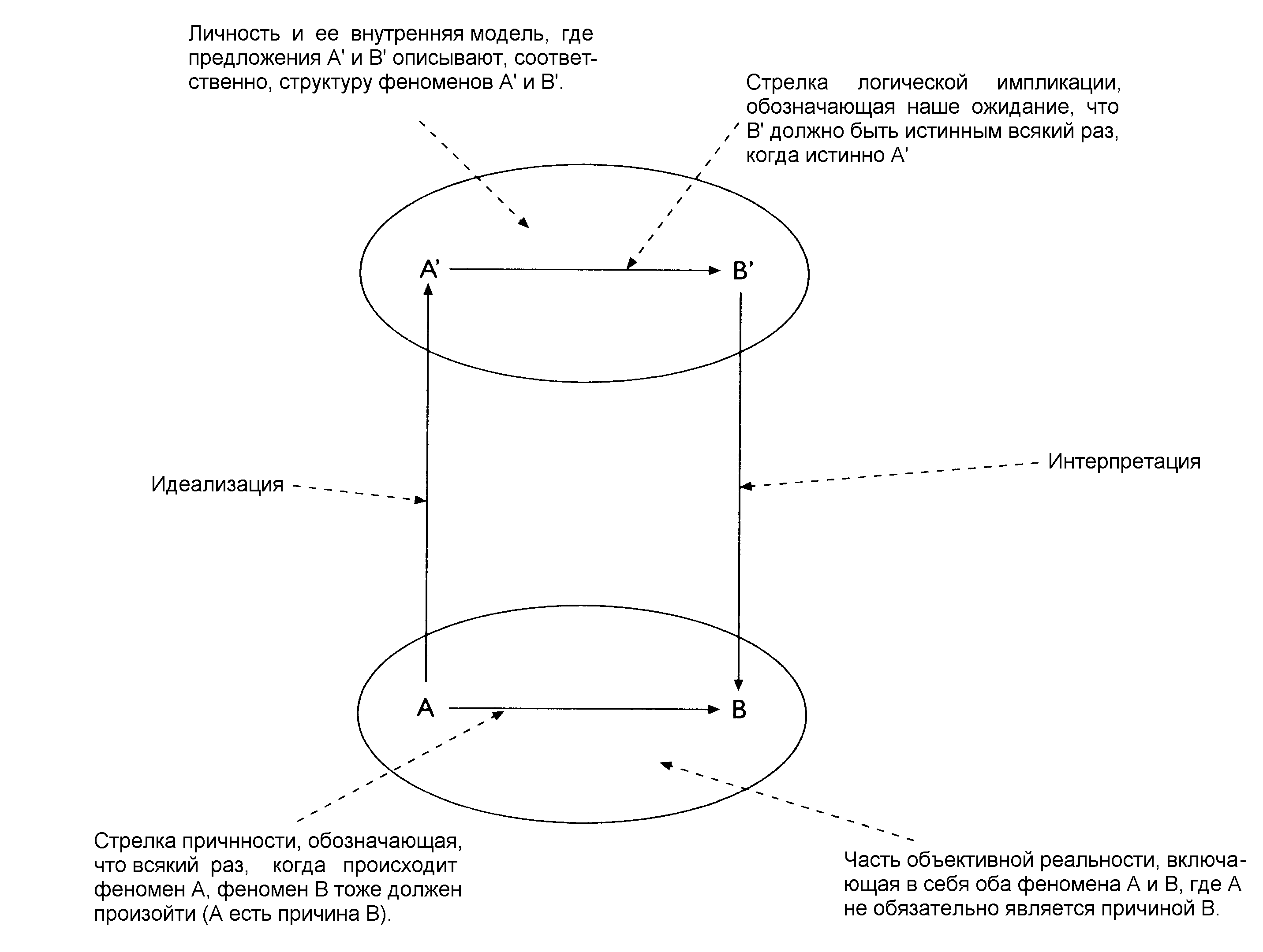 Таким образом, по нашему представлению, причинная связь представляет собой прежде всего логические отношения (B существует на основании A). Такие отношения могут вполне подразумевать временную последовательность, если A и B - материальные события, но мы не утверждаем, что такая последовательность будет необходимым (логическим) аспектом причинной связи. В свете нашего подхода, многие из классических проблем причинности (например, продвинутые Кантом в его обсуждении антиномий), могут рассматриваться как возникшие из спорных предположений, которые сводят причинную связь к последовательным во времени отношениям между материальными событиями.